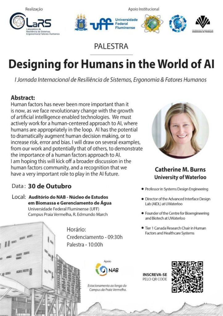 Palestra da Profa. Catherine Burns, que o Laboratorio LARS (coordenado pelo prof. Rodrigo Arcuri, do Programa PPGEP UFF Niterói) está organizando no âmbito da I Jornada de Resiliência de Sistemas, Ergonomia & Fatores Humanos. Aos docentes e discentes que tiverem disponibilidade, será um prazer tê-los conosco (palestra presencial, auditório do NAB UFF, em 30/10/2025).