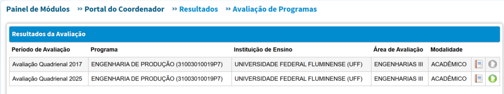A Coordenação do Programa de Pós-Graduação em Engenharia de Produção da Universidade Federal Fluminense (PPGEP/UFF Niterói) informa que foi publicado o resultado oficial da Avaliação Quadrienal 2025 da CAPES, referente ao quadriênio 2021–2024, no qual o Programa recebeu recomendação de conceito 4, posteriormente ratificada pelo Conselho Técnico-Científico da Educação Superior (CTC-ES) .