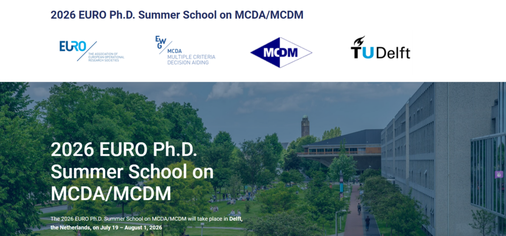 O Programa de Pós-Graduação em Engenharia de Produção (PPGEP/UFF Niterói) divulga aos seus discentes a Escola de Verão de Doutoramento EURO 2026 em MCDA/MCDM – https://mcdmsummerschool.tudelft.nl/ , que será realizada na Universidade de Tecnologia de Delft (TU Delft – https://www.tudelft.nl/en/ ), em Delft, Holanda, no período de 19 de julho a 1º de agosto de 2026.