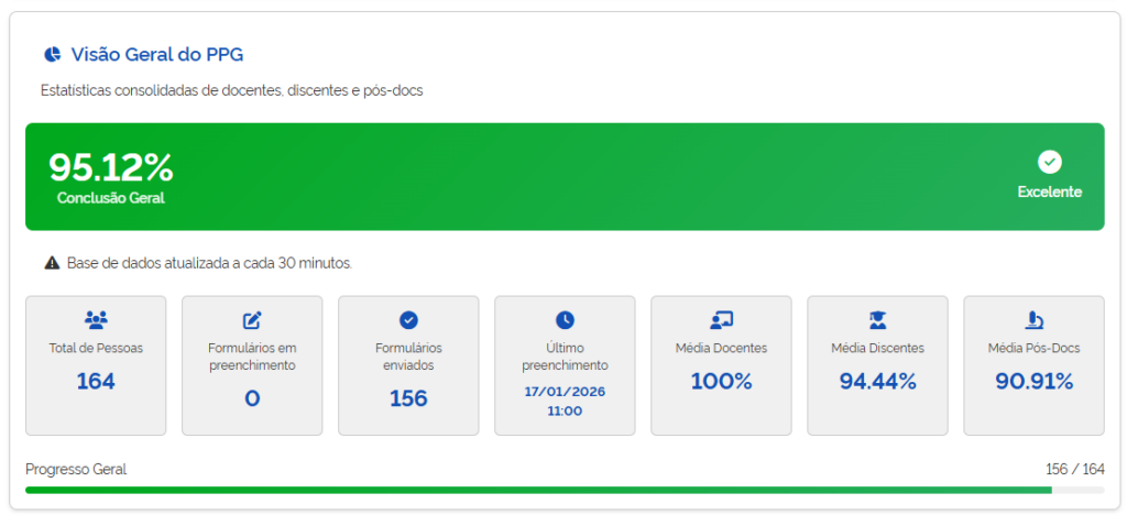 O Programa de Pós-Graduação em Engenharia de Produção (PPGEP/UFF Niterói) registra, com grande satisfação, o alcance de 95,12% de adesão ao Censo Anual da Pós-Graduação Stricto Sensu, resultado da colaboração efetiva de docentes, discentes, pós-doutorandos e da coordenação do Programa. Conclusão geral:95,12% – Excelente resultado (até o dia 17/01/2026, às 11h), foram enviados 156 formulários de um total de 164 pessoas.