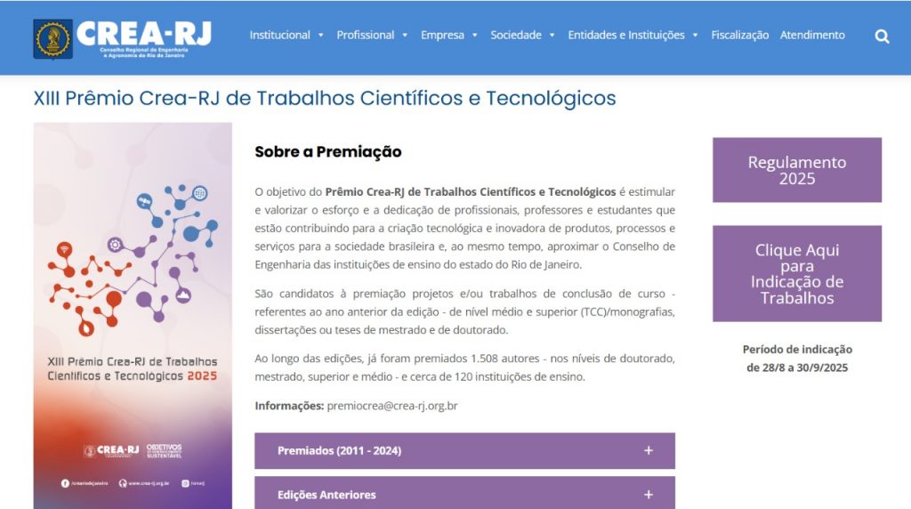 O Conselho Regional de Engenharia e Agronomia do Rio de Janeiro (Crea-RJ) comunica que estão abertas as inscrições para a 13ª edição do Prêmio Crea-RJ de Trabalhos Científicos e Tecnológicos, voltado para projetos desenvolvidos em 2024