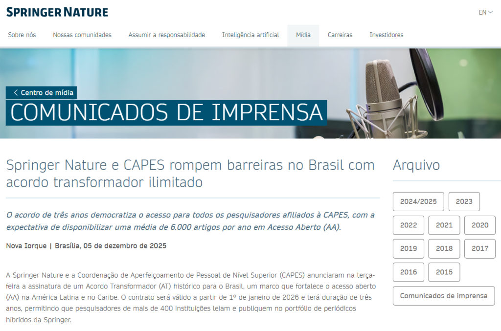 Esses acordos de licença de acesso ao conteúdo científico iniicam em 1º de janeiro de 2026 e terá duração de três anos e representam um avanço concreto para a democratização do conhecimento e o fortalecimento da produção científica nacional (Noticia, 03/01/2026).